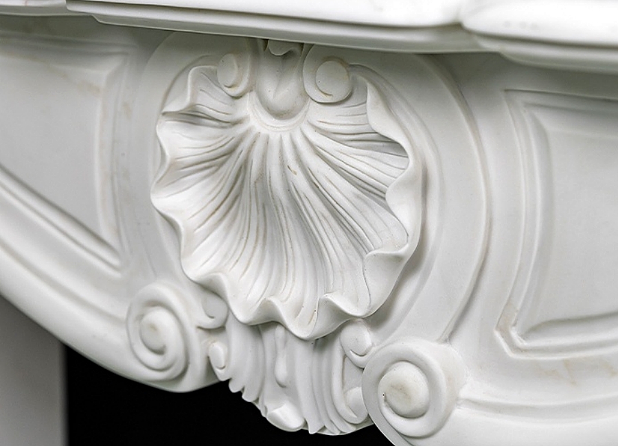 Introducing our elegant Louis XV White Marble Fireplace, a masterpiece adorned with a meticulously hand-carved shell motif from the finest natural marble. This stunning piece features a very light white hue that brings a touch of classic elegance and sophistication to any space.