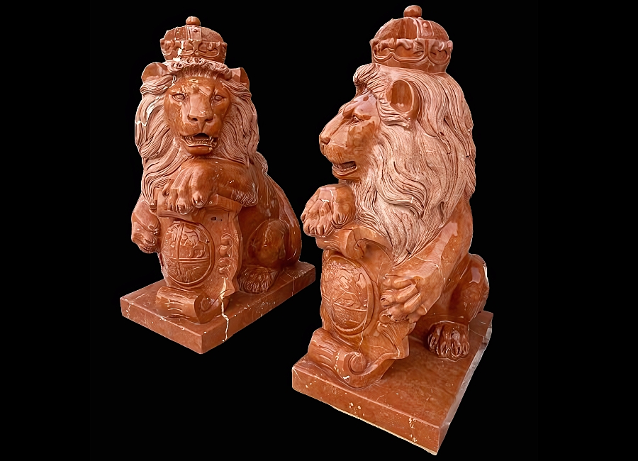 Each lion statue is meticulously carved from high-quality Rosso Alicante marble, known for its striking red hue and natural veining. The lifelike details and powerful stance of the lions reflect the exceptional skill and artistry involved in their creation.